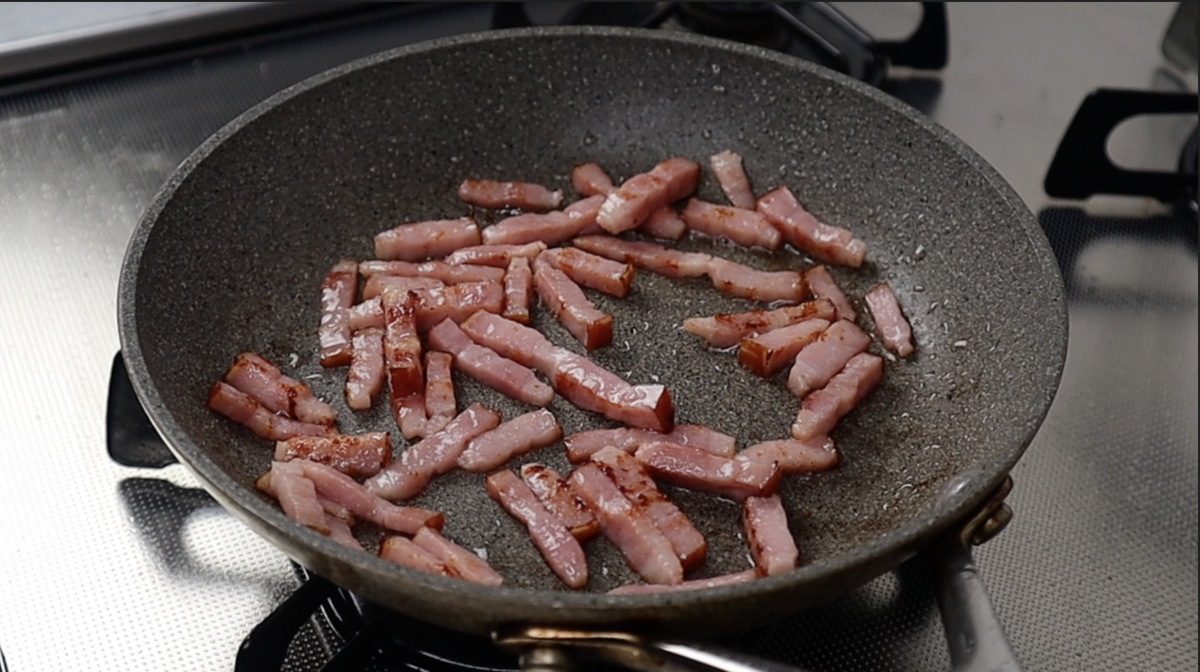 2.フライパンにサラダ油と短冊切りにした厚切りベーコンを加えベーコンがカリッとするまで弱火でじっくり炒めたら一度取り出す。ベーコンのうま味と香りが詰まった油は拭き取らず水と塩を加えて沸かしたら、サラダスパゲッティを加え茹で汁が無くなるまで中火でパスタを煮込む。