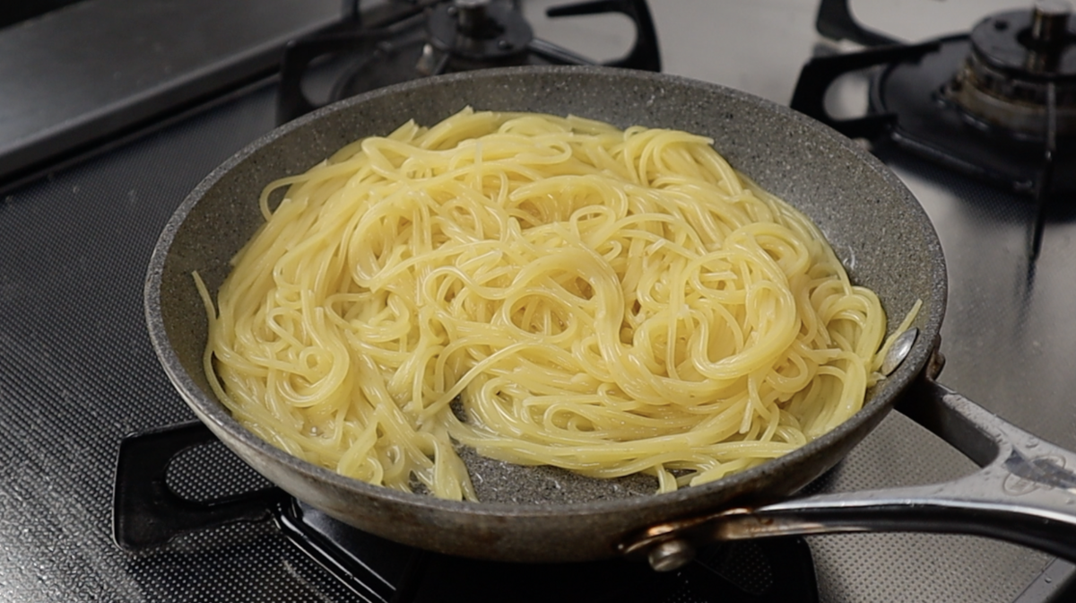 スパゲッティに芯が残っている場合は追加でお水を50mlずつ加え都度水分が飛ぶまで煮込むこと