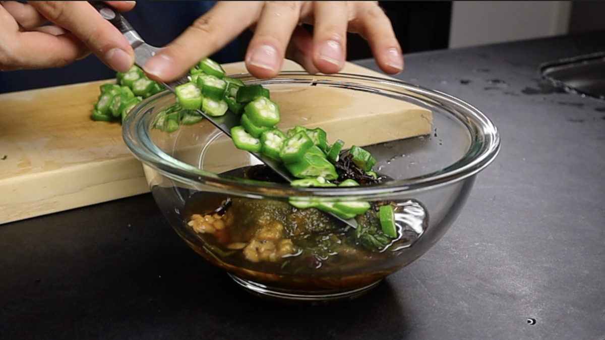 1.ボウルに○を全て入れておく。板づりしガクとヘタを取ったオクラを沸かしたお湯に入れ1分ほど湯通ししたら、流水でオクラの粗熱を取り小口切りにしてボウルに加え粘り気が出るまでよく混ぜる。粘り気が出たら冷蔵庫でしっかり冷やしておく。