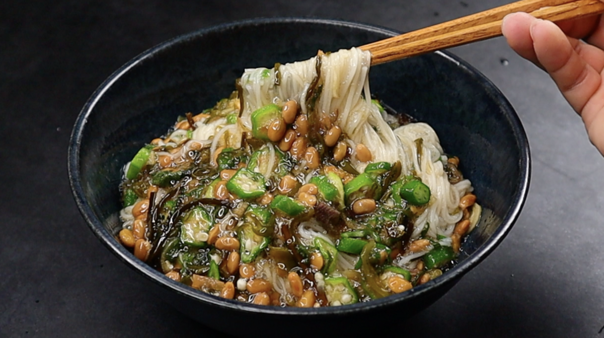 今回はオクラ、雌株、納豆などネバネバ食材をたっぷり使用したそうめんで夏バテにも最高!