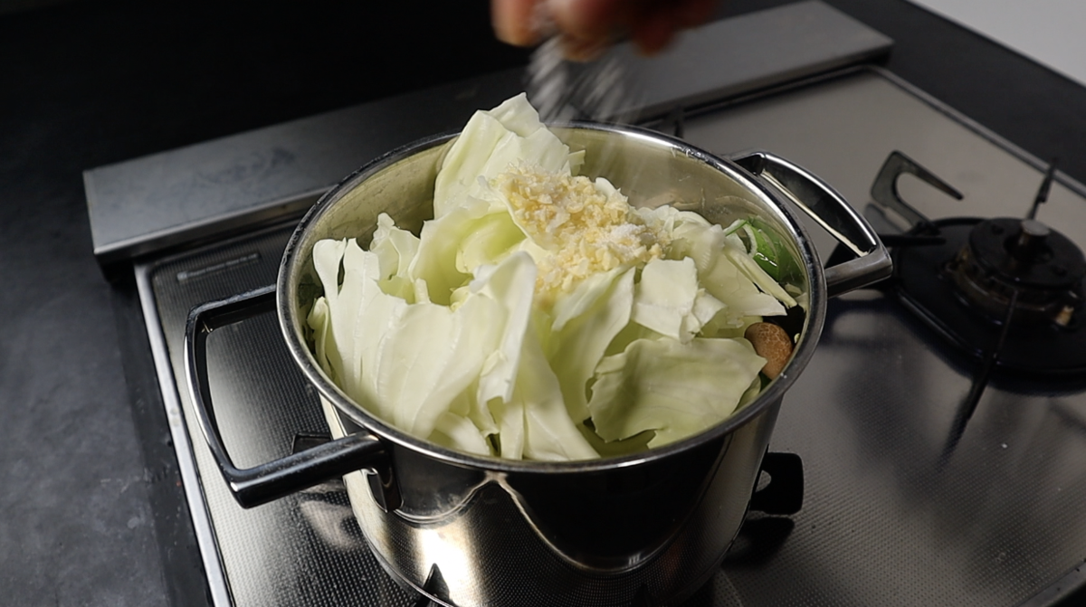 2.お鍋にAを入れて中火で加熱し食材の水分を飛ばしながら2~3分炒めたら、お水を加えて沸騰させアクを取り除く。