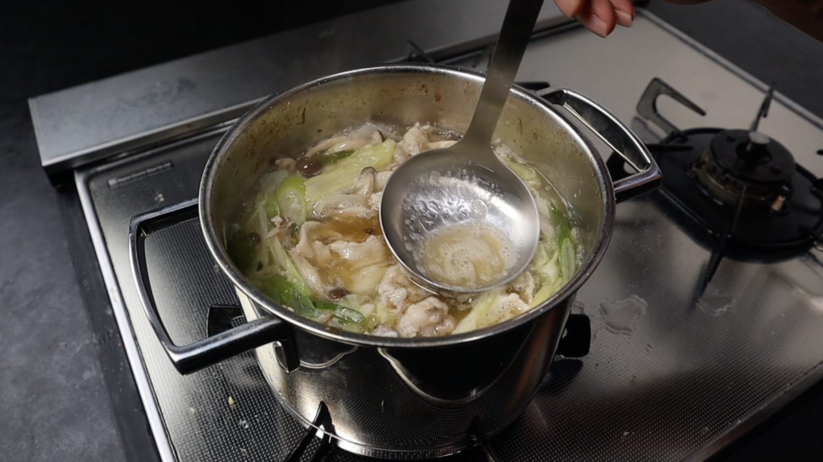 3.アクを取り除いたら火を消して混ぜておいた調味液を回しかけて馴染ませる。再び弱火で加熱し卵を人数分それぞれ離して割り入れたら半熟になるまで2~3分弱火で加熱する。最後にお椀に盛り付けお好みで七味や刻みネギ、山椒をかけたら完成。