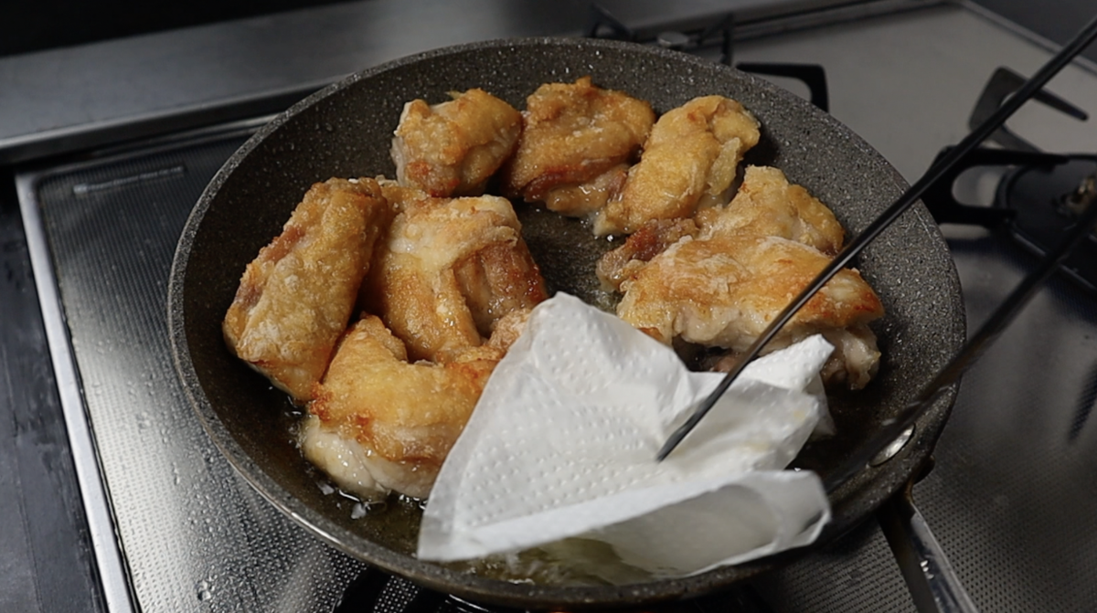 今回のレシピは普通の唐揚げにも応用できるレシピ!この通りに作ると大さじ2の油だけでも衣がカリッと仕上がります!(今回はタレに絡めるのでカリッと感は半減しますが...)