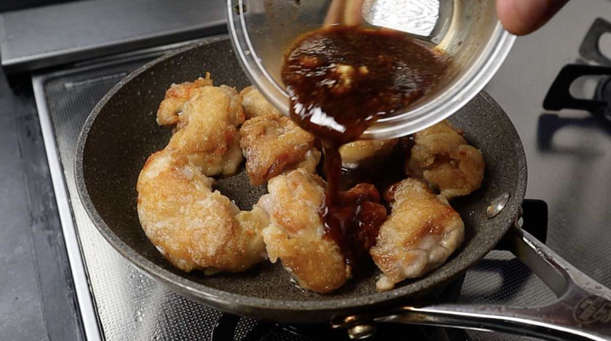 鶏肉の表面に片栗粉をまぶすことで鶏肉の肉汁を中に閉じ込めることができタレも馴染みやすくなる!