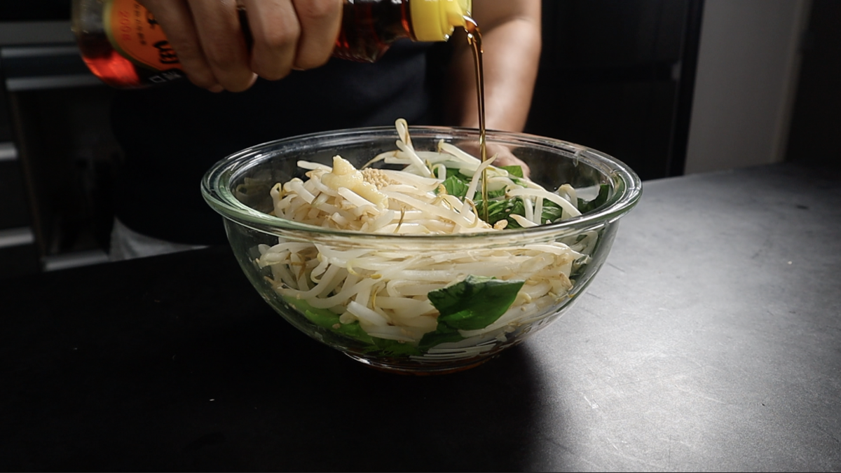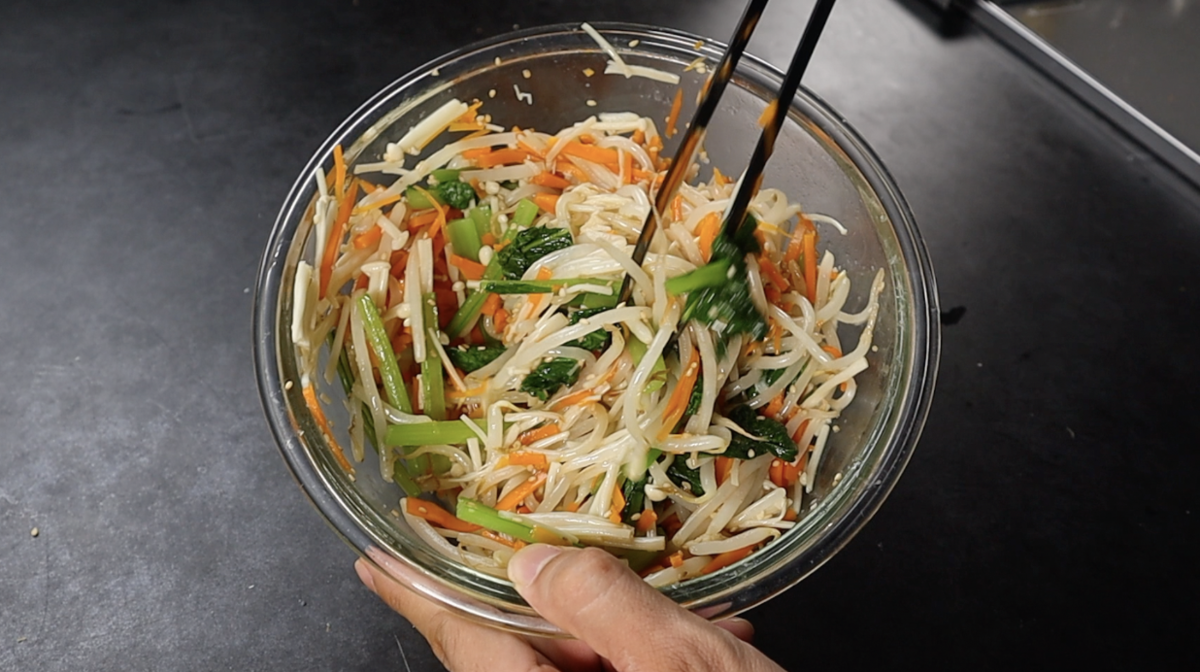 2.Aの野菜を耐熱容器に全て入れふんわりラップをし600wのレンジで5分加熱したら野菜から出た水気をよく切りBを全て加えよく和える。(ナムルの完成)