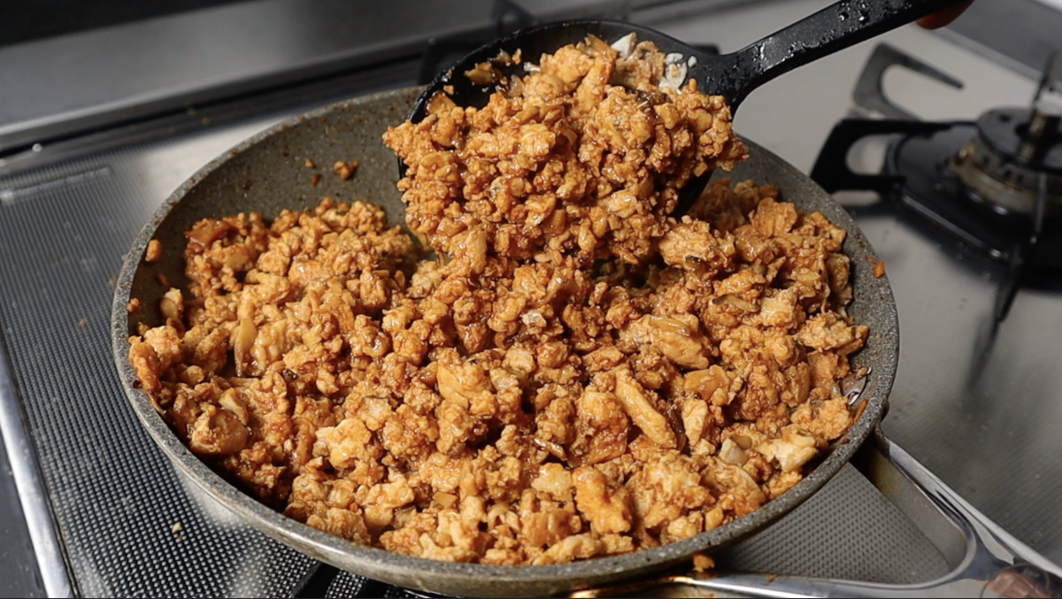 3.韓国風肉味噌を作る。フライパンにごま油、鶏むねミンチ、椎茸、塩を入れたら、中火で加熱し炒めていくうちに鶏むねミンチから出た水分を飛ばすようによく炒める。鶏むねミンチの水分が完全に飛べばCを全て加え汁気が無くなるまで炒める。(韓国風肉味噌の完成)