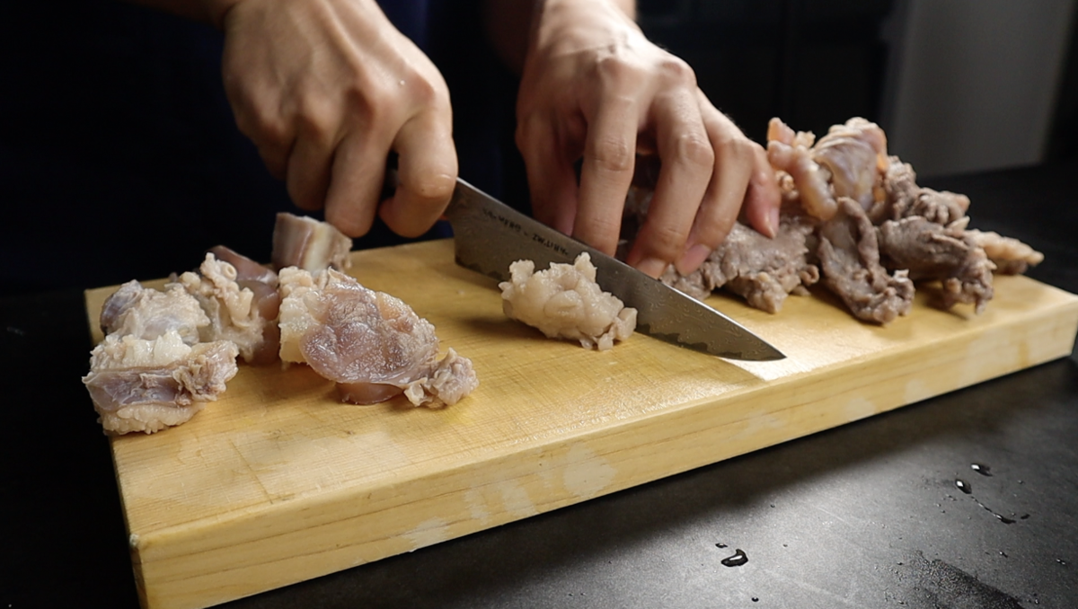 1.鍋に牛すじと牛すじが被るくらいの水を入れて中火で沸かし沸騰してから3~4分茹でこぼしたら、ぬるま湯でアクと汚れを落とし食べやすい大きさに切る。