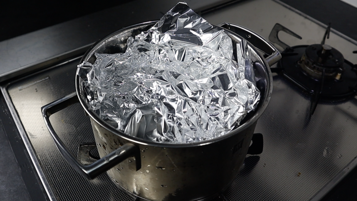 2.牛すじを茹でこぼした鍋は汚れが付いているので一度綺麗に洗う。洗った鍋に茹でこぼした牛すじと長ネギの青い部分、生姜、ニンニク、お水(牛すじ下茹で用)、料理酒を入れアルミホイルで落とし蓋をしたら、中火で加熱して沸かす。お湯が沸いたら弱火に切り替え最低でも40分、できれば1時間下茹でする。