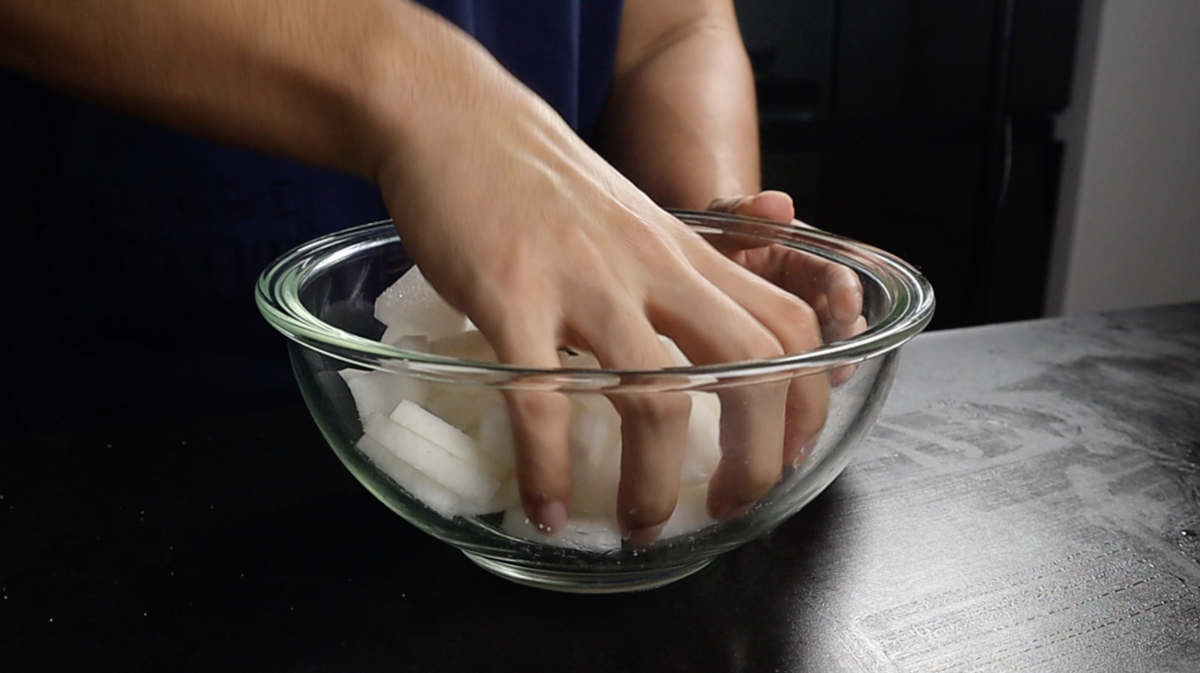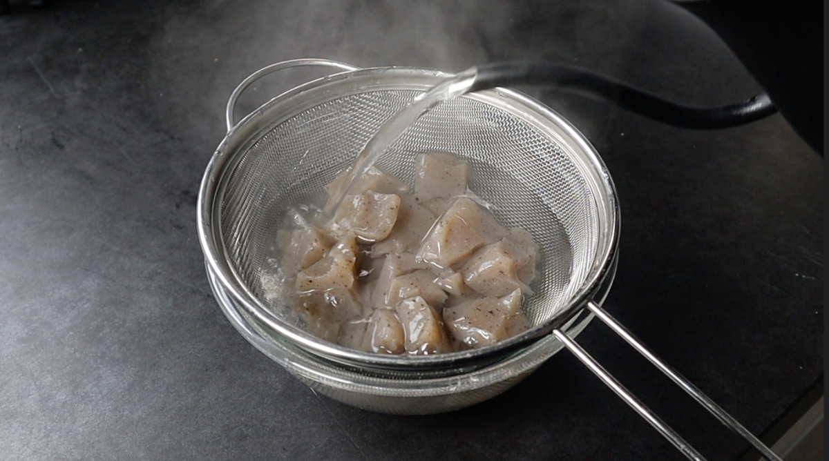 3.牛すじを下茹でしている間に他の材料の下ごしらえをする。大根の皮を分厚く剥き1cm幅のいちょう切りにしたら、ボウルに塩と共に入れて塩揉みし10分置いておく。こんにゃくは両面に切れ込みを入れスプーンを使って一口大に切ったら、ボウルにこんにゃくを入れて沸騰したお湯をかけてアク抜きし、2分浸けておく。