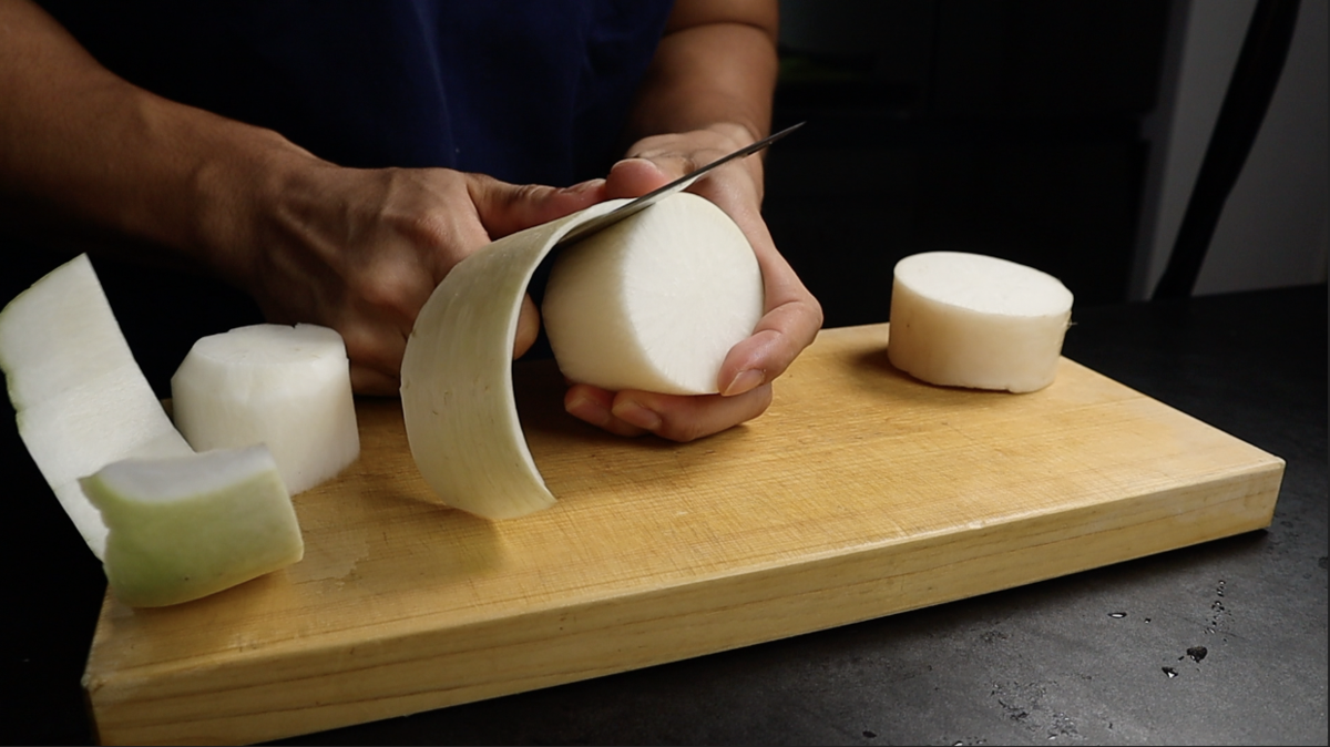 大根の皮の周りは繊維質で食感も悪くアクや苦味も強いので分厚めに皮を剥くこと!