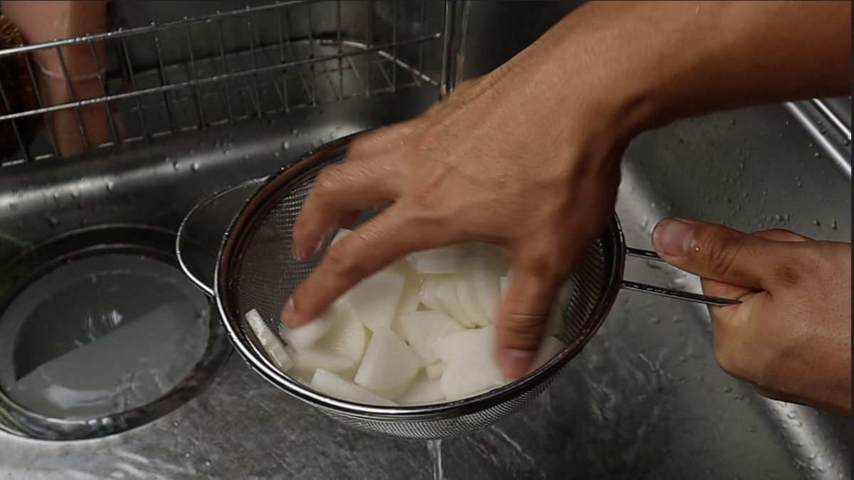 4. 大根、こんにゃく共に時間が経てば水でよく洗い塩やアクを取り除く。牛すじを40分〜1時間茹でたらこれで下茹で完了。