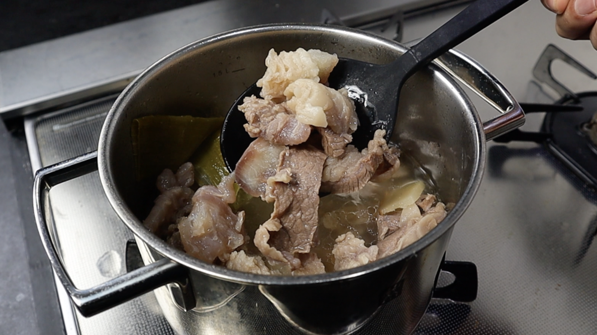 時間をかけて弱火でじっくり下茹ですることで牛すじの硬い腱や筋がほぐれ柔らかく茹で上がる