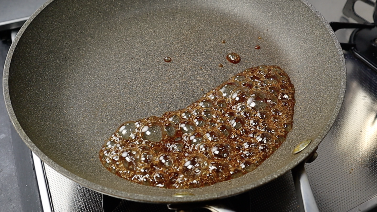 5.大きいフライパンもしくは鍋にザラメ(砂糖)とお水(カラメル用)を加えたら、中火で加熱しザラメ(砂糖)を焦がしてカラメルを作る。カラメルになれば○を加えカラメルを調味料で伸ばすようによく混ぜ合わせる。