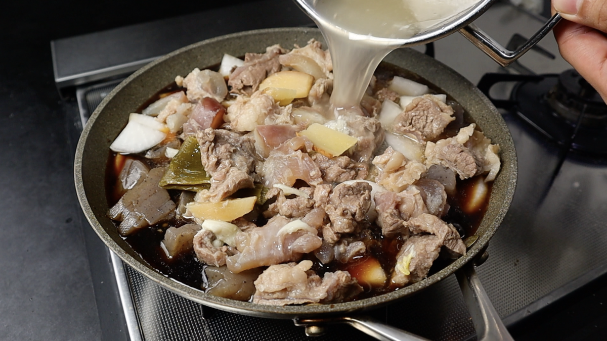 たっぷりの料理酒を使用して下茹ですることで牛すじの臭みを飛ばすことができる他、料理酒のうま味もプラスされより美味しい仕上がりに!