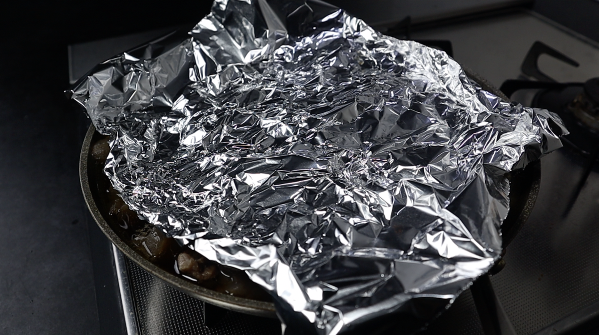 6.カラメルが調味料に馴染めば牛すじを下茹でした鍋に入っている全ての食材と全ての茹で汁を加え、上からアルミホイルで落とし蓋をし煮汁が半分以下になるまで弱火でじっくり煮込む。(時々上下返すように動かしてください)