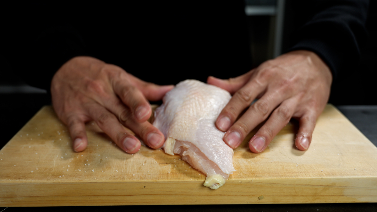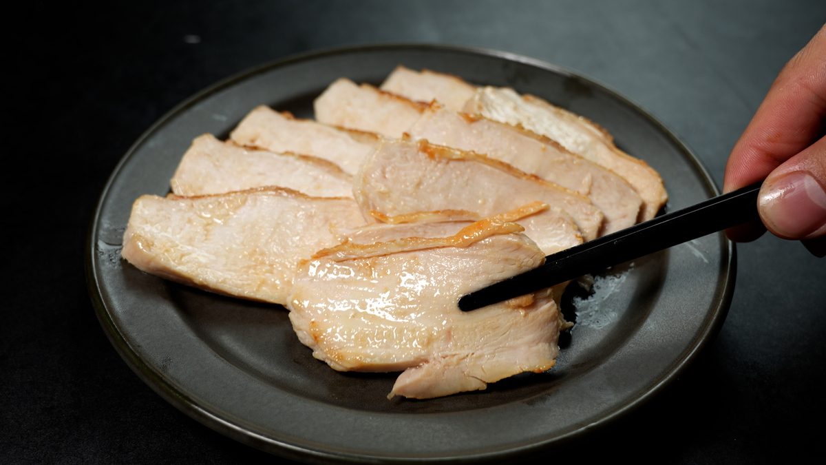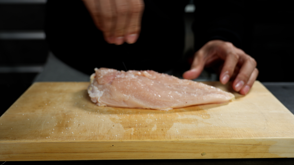 鶏むね肉の身側にのみ塩を振り、鶏皮の面には塩をしないことで鶏皮にこんがり焼き色を付け、香ばしさを引き出すことができる