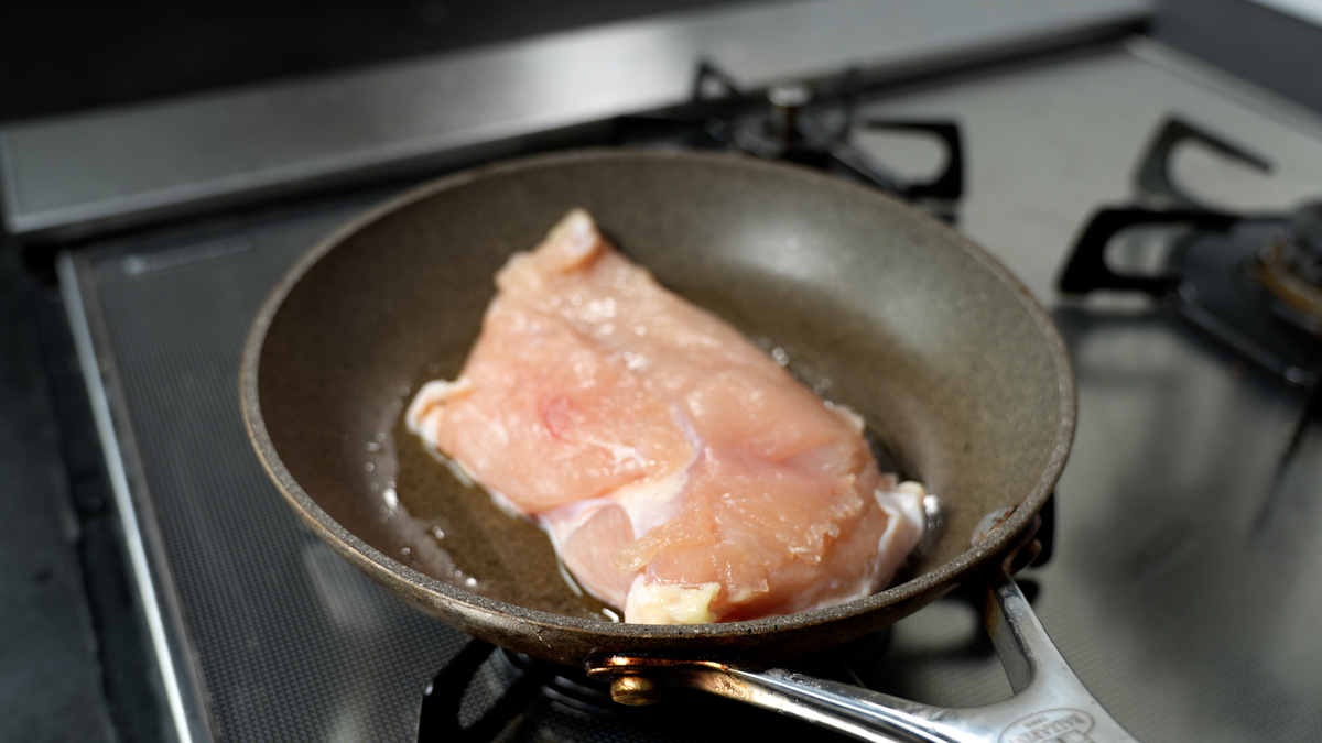 2.フライパンにオリーブオイルを引いて伸ばし鶏皮をピンと伸ばした状態を維持しながら鶏皮を下にして鶏むね肉を入れる。アルミホイルでフライパン全体を包み鶏むね肉の上から重石をのせたら、弱火で加熱して15分触らずに焼き上げる。