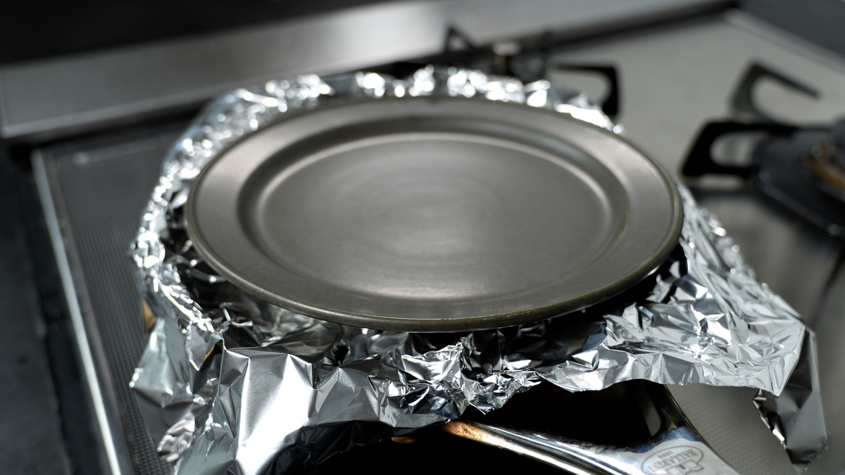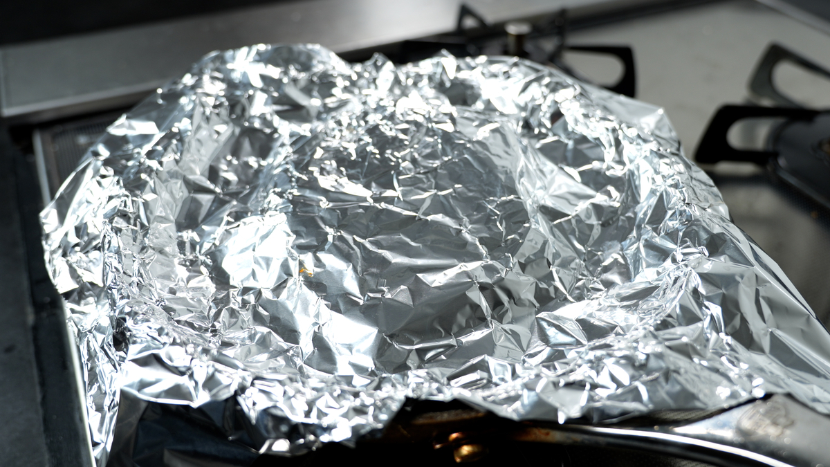 アルミホイルを上から被せることで油が飛び散るのを防ぐ他、熱が逃げづらくなり鶏胸肉の中までしっかり火を通すことができる