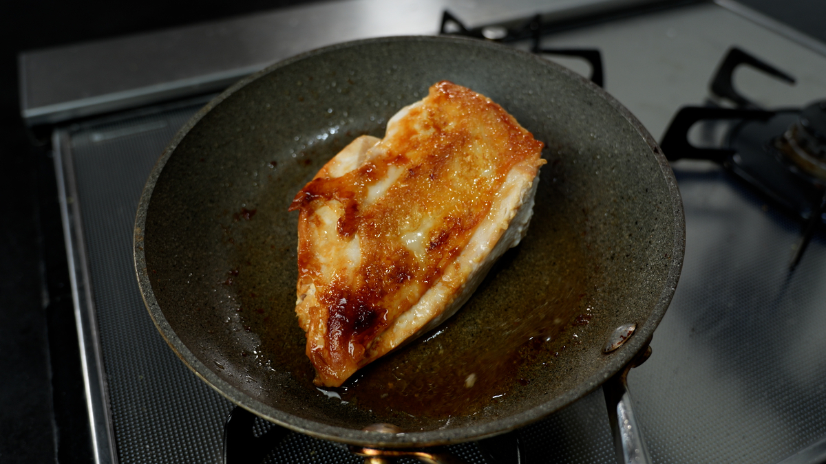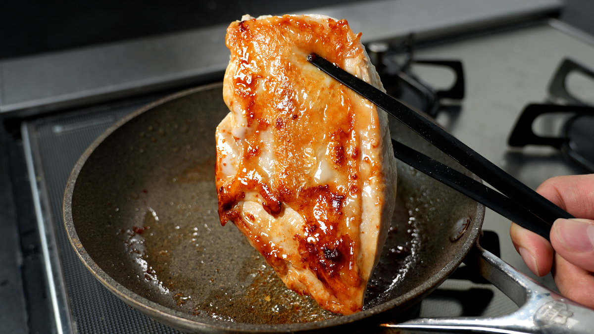 鶏皮を下にしてホイルを被せ弱火で15分、その後裏返して再びホイルを被せて火を消し10分余熱で火を通すことで鶏胸肉の中までしっかり火を通すことができる他パサつくことなくしっとりジューシーな仕上がりに!