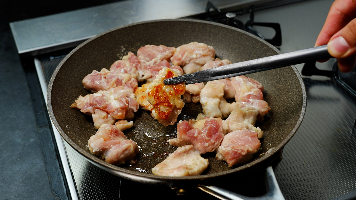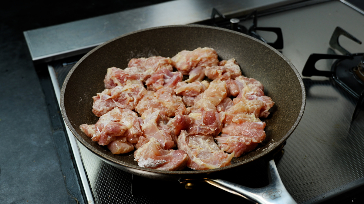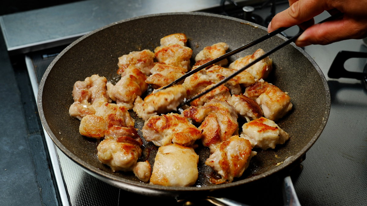 片面は中火でこんがり焼き色を付け、裏面は弱火でじっくり火を通すことで、鶏肉が焼けた香ばしい香りを引き出しつつ、パサつかずしっとり柔らかい仕上がりに