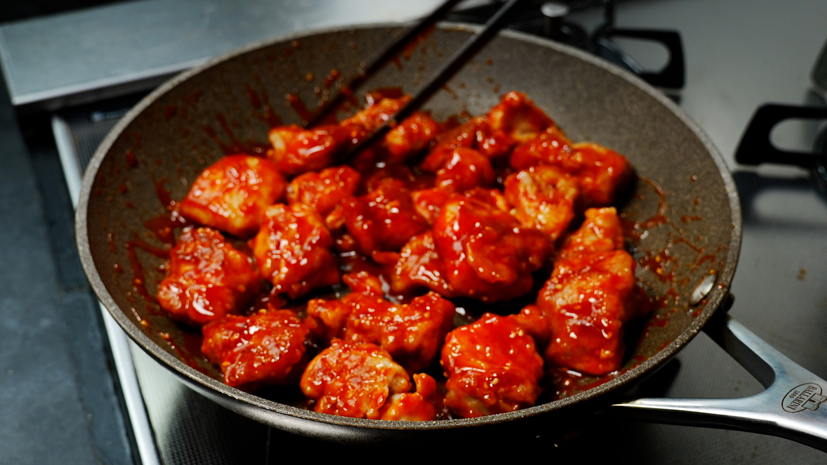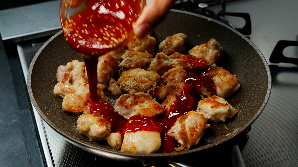 4.冷たいフライパンにごま油と鶏肉を入れ中火で加熱したら、片面にこんがり焼き色が付くまで焼いて裏返す。裏面は弱火でじっくり焼き上げたら、混ぜ合わせたタレを回しかけて鶏肉にサッと絡める。
