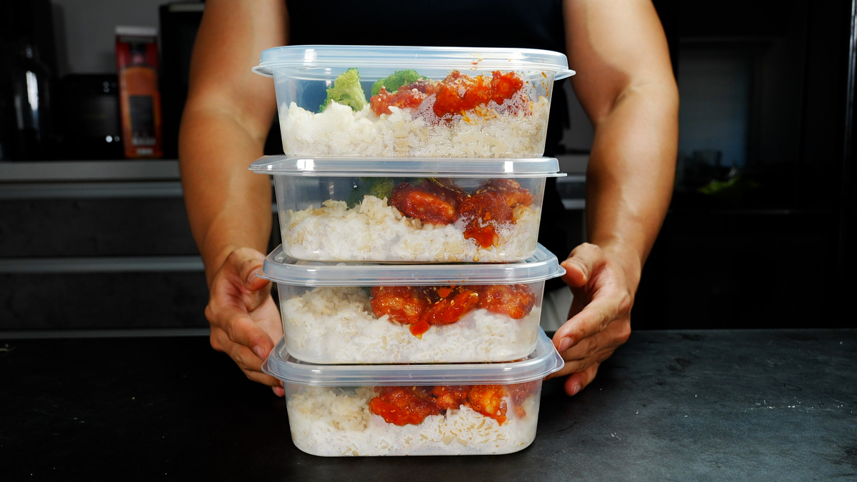 5.保存容器に男性なら4食分、女性なら5食分にエノキご飯とヤンニョムチキンを分けて盛り付け(お好みで副菜を盛り付けても)粗熱を取ったら、蓋をして冷凍保存する。